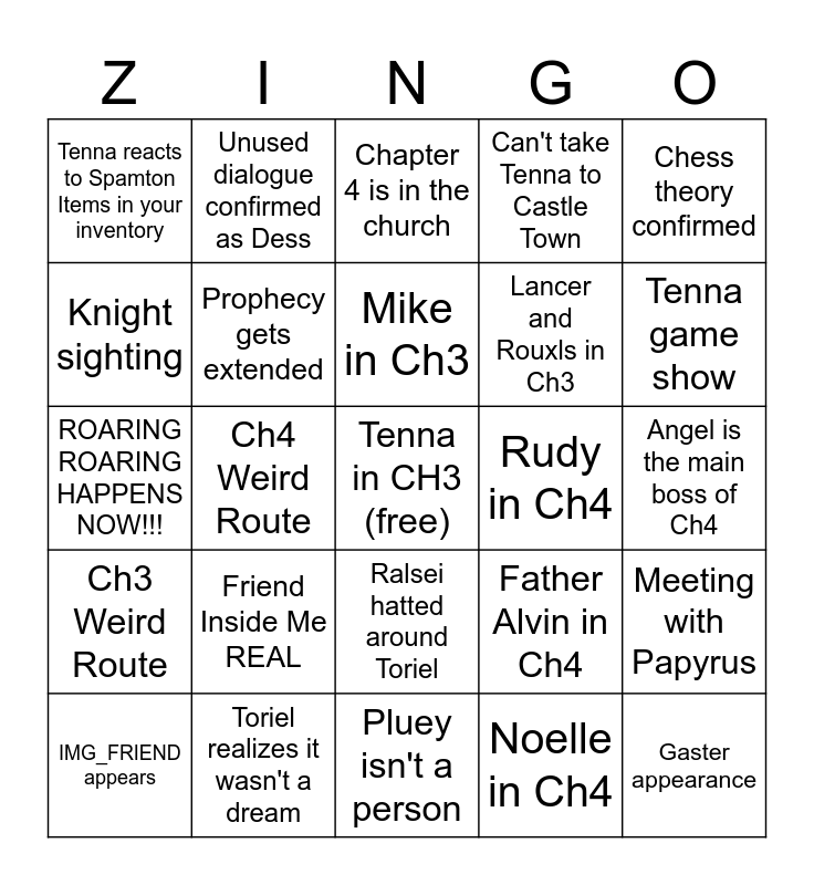 This bingo card has a free space and 24 words: IMG_FRIEND appears, Friend Inside Me REAL, Mike in Ch3, Noelle in Ch4, Chess theory confirmed, Tenna reacts to Spamton Items in your inventory, Unused dialogue confirmed as Dess, Chapter 4 is in the church, Rudy in Ch4, Angel is the main boss of Ch4, ROARING ROARING HAPPENS NOW!!!, Prophecy gets extended, Father Alvin in Ch4, Meeting with Papyrus, Knight sighting, Toriel realizes it wasn't a dream, Pluey isn't a person, Can't take Tenna to Castle Town, Tenna game show, Ch3 Weird Route, Ch4 Weird Route, Ralsei hatted around Toriel, Lancer and Rouxls in Ch3 and Gaster appearance.