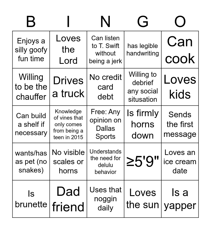 This bingo card has a free space and 24 words: No visible scales or horns, Dad friend, No credit card debt, Is brunette, Can cook, Enjoys a silly goofy fun time, Willing to be the chauffer, Loves the Lord, Is firmly horns down, Understands the need for delulu behavior, Willing to debrief any social situsation, Can build a shelf if necessary, ≥5'9", Loves an ice cream date, Drives a truck, Loves the sun, Sends the first message, Can listen to T. Swift without being a jerk, Loves kids, Knowledge of vines that only comes from being a teen in 2015, Is a yapper, wants/has as pet (no snakes), has legible handwriting and Uses that noggin daily.