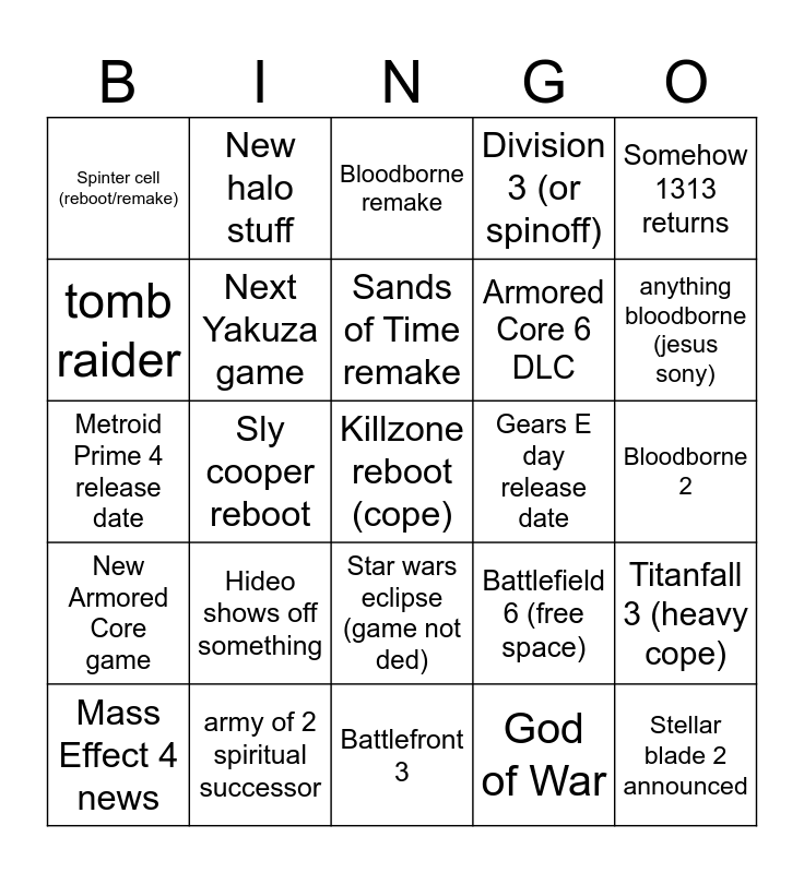 This bingo card has 25 words: Hideo shows off something, Battlefront 3, Sands of Time remake, Mass Effect 4 news, Somehow 1313 returns, Spinter cell (reboot/remake), tomb raider, New halo stuff, Gears E day release date, Star wars eclipse (game not ded), Armored Core 6 DLC, Metroid Prime 4 release date, Battlefield 6 (free space), Titanfall 3 (heavy cope), Next Yakuza game, Stellar blade 2 announced, Bloodborne 2, Bloodborne remake, anything bloodborne (jesus sony), Sly cooper reboot, Killzone reboot (cope), army of 2 spiritual successor, New Armored Core game, Division 3 (or spinoff) and God of War.
