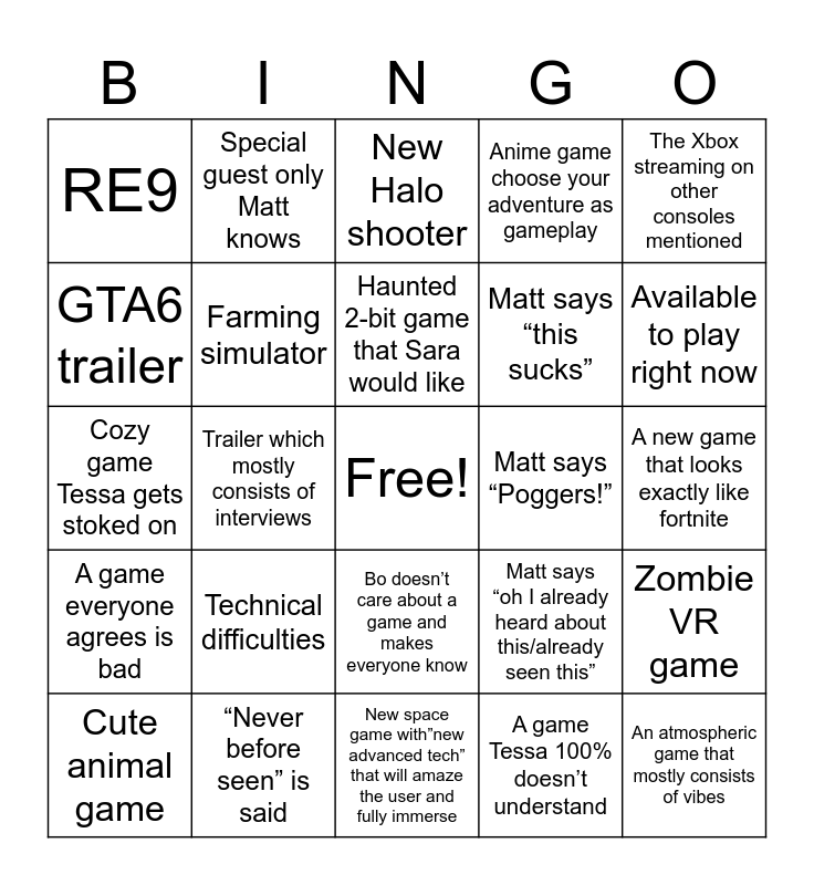 This bingo card has a free space and 24 words: Technical difficulties, “Never before seen” is said, Haunted 2-bit game that Sara would like, Cute animal game, The Xbox streaming on other consoles mentioned, RE9, GTA6 trailer, Special guest only Matt knows, Matt says “Poggers!”, Bo doesn’t care about a game and makes everyone know, Matt says “this sucks”, Cozy game Tessa gets stoked on, Matt says “oh I already heard about this/already seen this”, Zombie VR game, Farming simulator, A game Tessa 100% doesn’t understand, A new game that looks exactly like fortnite, New Halo shooter, Available to play right now, Trailer which mostly consists of interviews, An atmospheric game that mostly consists of vibes, A game everyone agrees is bad, Anime game choose your adventure as gameplay and New space game with”new advanced tech” that will amaze the user and fully immerse.