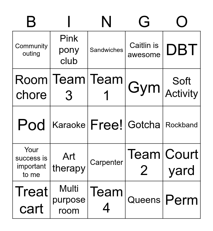 This bingo card has a free space and 24 words: Art therapy, Multi purpose room, Team 1, Treat cart, DBT, Community outing, Room chore, Pink pony club, Gotcha, Carpenter, Gym, Pod, Team 2, Court yard, Team 3, Queens, Rockband, Sandwiches, Soft Activity, Karaoke, Perm, Your success is important to me, Caitlin is awesome and Team 4.