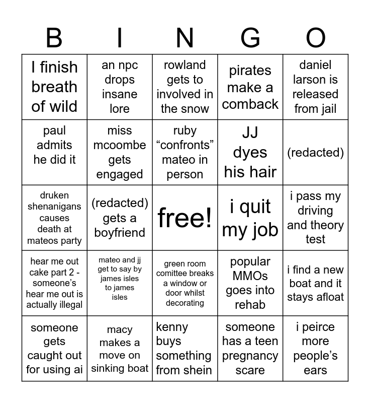 This bingo card has a free space and 24 words: mateo and jj get to say by james isles to james isles, macy makes a move on sinking boat, ruby “confronts” mateo in person, someone gets caught out for using ai, daniel larson is released from jail, I finish breath of wild, paul admits he did it, an npc drops insane lore, i quit my job, green room comittee breaks a window or door whilst decorating, JJ dyes his hair, druken shenanigans causes death at mateos party, popular MMOs goes into rehab, i find a new boat and it stays afloat, miss mcoombe gets engaged, someone has a teen pregnancy scare, i pass my driving and theory test, rowland gets to involved in the snow, (redacted), (redacted) gets a boyfriend, i peirce more people’s ears, hear me out cake part 2 - someone’s hear me out is actually illegal, pirates make a comback and kenny buys something from shein.