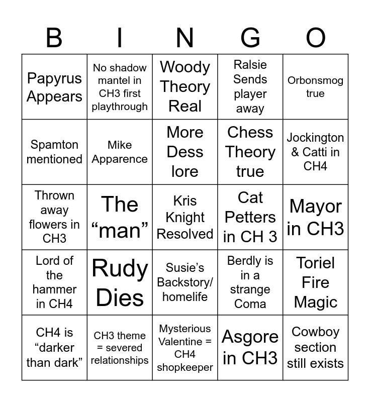 This bingo card has a free space and 24 words: Rudy Dies, CH3 theme = severed relationships, More Dess lore, CH4 is “darker than dark”, Orbonsmog true, Papyrus Appears, Spamton mentioned, No shadow mantel in CH3 first playthrough, Cat Petters in CH 3, Susie’s Backstory/ homelife, Chess Theory true, Thrown away flowers in CH3, Berdly is in a strange Coma, Toriel Fire Magic, Mike Apparence, Asgore in CH3, Mayor in CH3, Woody Theory Real, Jockington & Catti in CH4, The “man”, Cowboy section still exists, Lord of the hammer in CH4, Ralsie Sends player away and Mysterious Valentine = CH4 shopkeeper.