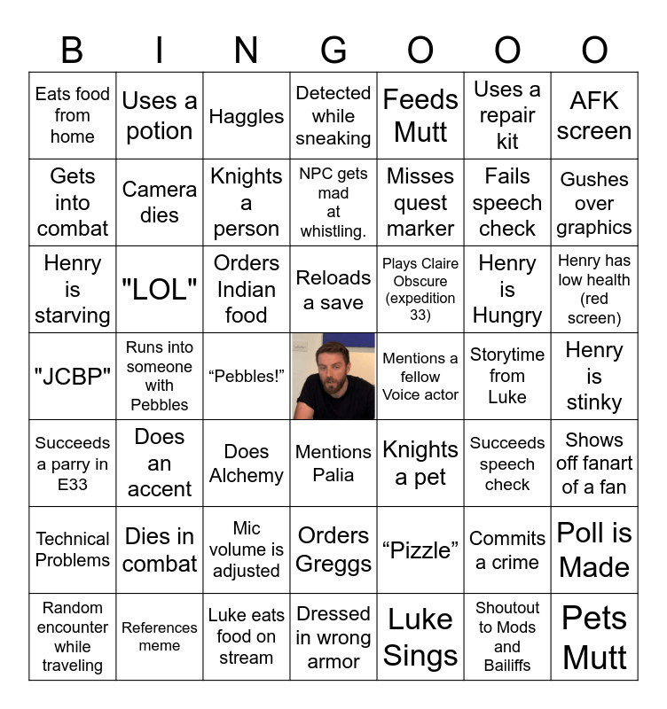 This bingo card has a free space and 58 words: "Audentes", "JCBP", "Peasants", "LOL", “Pebbles!”, “Pizzle”, AFK screen, Armor is fully repaired/ no pieces damaged, Camera dies, Commits a crime, Detected while sneaking, Dies in combat, Does Alchemy, Does an accent, Dressed in wrong armor, Eats food from home, Fails speech check, Feeds Mutt, Gets emotional, Gets into combat, Gushes over graphics, Haggles, Henry has low health (red screen), Henry is Hungry, Henry is overloaded, Henry is starving, Henry is stinky, Impression of a character, Knights a person, Knights a pet, Luke Blushes, Technical Problems, Luke eats food on stream, Luke Sings, Mentions a fellow Voice actor, Mentions Palia, Mic volume is adjusted, Misses quest marker, NPC gets mad at whistling., Orders Greggs, Orders Indian food, Pets Mutt, Plays Claire Obscure (expedition 33), Plays Dice, Poll is Made, Random encounter while traveling, References meme, Reloads a save, Runs into someone with Pebbles, Shoutout to Mods and Bailiffs, Shows off fanart of a fan, Storytime from Luke, Succeeds a parry in E33, Succeeds speech check, Uses a potion, Uses a ranged weapon, Uses a repair kit and Washes Henry in trough.