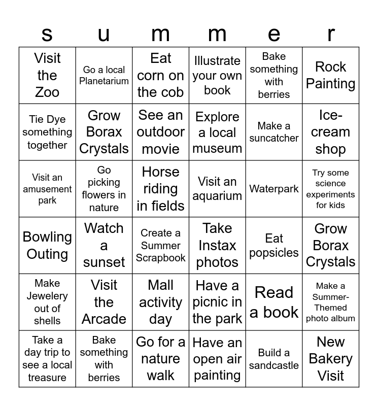 This bingo card has 36 words: Have a picnic in the park, Mall activity day, Have an open air painting, Tie Dye something together, Bowling Outing, Visit an aquarium, Grow Borax Crystals, Go for a nature walk, Bake something with berries, Read a book, Ice-cream shop, Illustrate your own book, Make a Summer-Themed photo album, Go picking flowers in nature, Explore a local museum, Visit the Zoo, Make Jewelery out of shells, Waterpark, Visit an amusement park, Eat corn on the cob, Horse riding in fields, Watch a sunset, Take Instax photos, Create a Summer Scrapbook, Eat popsicles, Go a local Planetarium, Make a suncatcher, Bake something with berries, See an outdoor movie, Rock Painting, New Bakery Visit, Take a day trip to see a local treasure, Grow Borax Crystals, Try some science experiments for kids, Visit the Arcade and Build a sandcastle.