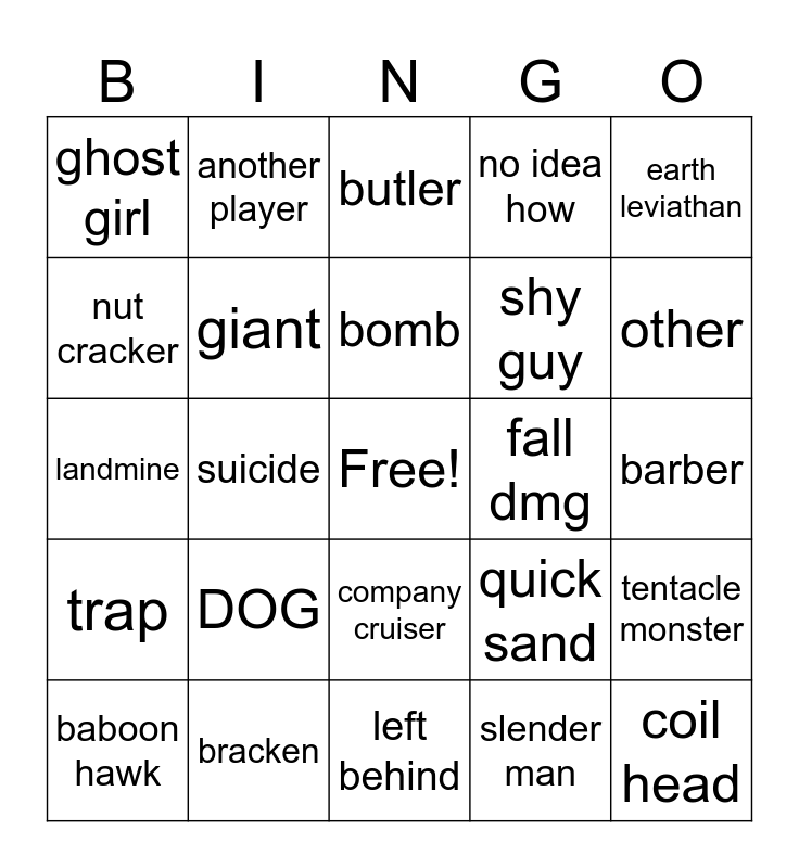 This bingo card has a free space and 24 words: DOG, bracken, bomb, baboon hawk, earth leviathan, ghost girl, nut cracker, another player, fall dmg, company cruiser, shy guy, landmine, quick sand, tentacle monster, giant, slender man, barber, butler, other, suicide, coil head, trap, no idea how and left behind.