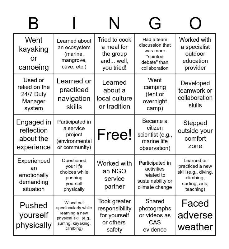 This bingo card has a free space and 24 words: Questioned your life choices while pushing yourself physically, Wiped out spectacularly while learning a new physical skill (e.g., surfing, kayaking, climbing), Learned about a local culture or tradition, Pushed yourself physically, Worked with a specialist outdoor education provider, Went kayaking or canoeing, Used or relied on the 24/7 Duty Manager system, Learned about an ecosystem (marine, mangrove, cave, etc.), Became a citizen scientist (e.g., marine life observation), Worked with an NGO service partner, Went camping (tent or overnight camp), Engaged in reflection about the experience, Participated in activities related to sustainability or climate change, Learned or practiced a new skill (e.g., diving, climbing, surfing, arts, teaching), Learned or practiced navigation skills, Shared photographs or videos as CAS evidence, Stepped outside your comfort zone, Tried to cook a meal for the group and... well, you tried!, Developed teamwork or collaboration skills, Participated in a service project (environmental or community), Faced adverse weather, Experienced an emotionally demanding situation, Had a team discussion that was more "spirited debate" than collaboration and Took greater responsibility for yourself or others' safety.