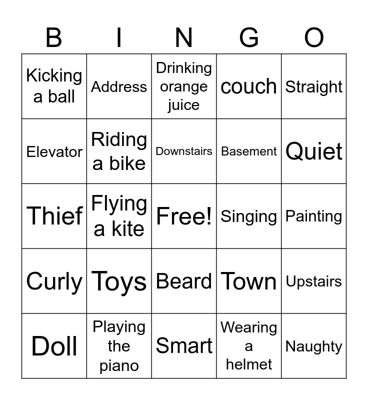 This bingo card has a free space and 29 words: Doll, Truck, Flying a kite, Taking a picture, Kicking a ball, Drinking orange juice, Riding a bike, Toys, Singing, Playing the piano, Painting, Naughty, Smart, Wearing a helmet, Quiet, Funny, Beard, Curly, Straight, Thief, Town, Country, Basement, Elevator, couch, Address, Upstairs, Downstairs and Stairs.