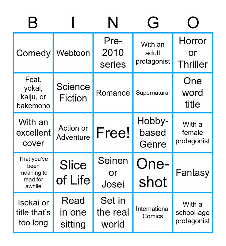 This bingo card has a free space and 38 words: Adapted to anime, Adapted from a light novel, Unadapted, Science Fiction, Fantasy, Slice of Life, Romance, Mystery or Crime, Horror or Thriller, Supernatural, Action or Adventure, With an adult protagonist, With a school-age protagonist, With a female protagonist, Feat. yokai, kaiju, or bakemono, That you’ve been meaning to read for awhile, Recommended by a community member, Pre-2010 series, Ongoing series, Hobby-based Genre, Comedy, Read in one sitting, One word title, Isekai or title that’s too long, Reread, Set in the real world, Dystopia or apocalyptic setting, By a favorite creator, Your least-read genre, Shonen, Shojo, Seinen or Josei, International Comics, Webtoon, …the friends we made along the way, One-shot, With an excellent cover and Set in a world different from ours.