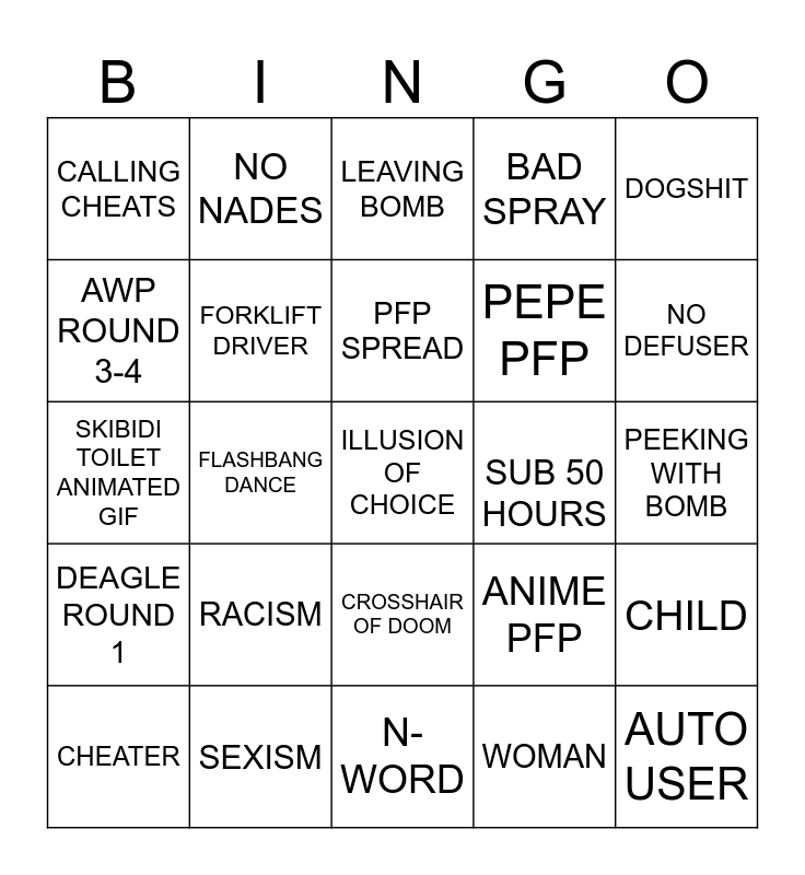 This bingo card has 25 words: RACISM, N-WORD, PFP SPREAD, CHEATER, DOGSHIT, CALLING CHEATS, AWP ROUND 3-4, NO NADES, SUB 50 HOURS, CROSSHAIR OF DOOM, PEPE PFP, SKIBIDI TOILET ANIMATED GIF, ANIME PFP, CHILD, FORKLIFT DRIVER, AUTO USER, PEEKING WITH BOMB, LEAVING BOMB, NO DEFUSER, FLASHBANG DANCE, ILLUSION OF CHOICE, SEXISM, DEAGLE ROUND 1, BAD SPRAY and WOMAN.