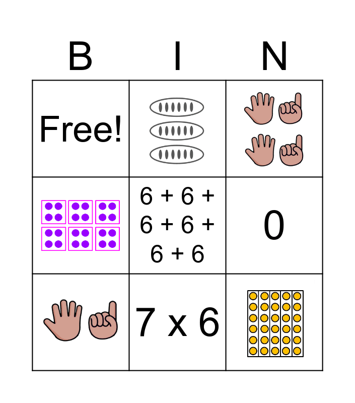 This bingo card has 5 images and 4 words: Free!, 0, 6 + 6 + 6 + 6 + 6 + 6 and 7 x 6.