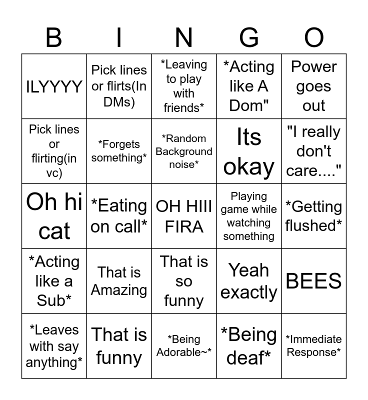 This bingo card has a free space and 24 words: That is Amazing, That is funny, *Random Background noise*, *Leaves with say anything*, Power goes out, ILYYYY, Pick lines or flirting(in vc), Pick lines or flirts(In DMs), Playing game while watching something, That is so funny, Its okay, Oh hi cat, Yeah exactly, BEES, *Forgets something*, *Being deaf*, *Getting flushed*, *Leaving to play with friends*, "I really don't care....", *Eating on call*, *Immediate Response*, *Acting like a Sub*, *Acting like A Dom" and *Being Adorable~*.