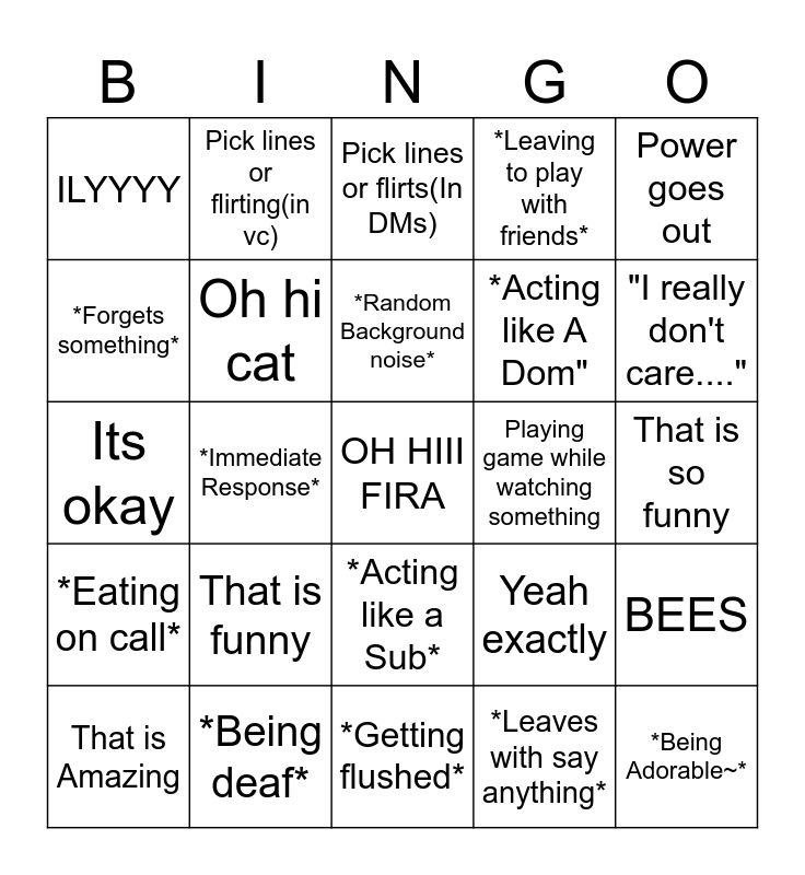 This bingo card has a free space and 24 words: That is Amazing, That is funny, *Random Background noise*, *Leaves with say anything*, Power goes out, ILYYYY, Pick lines or flirting(in vc), Pick lines or flirts(In DMs), Playing game while watching something, That is so funny, Its okay, Oh hi cat, Yeah exactly, BEES, *Forgets something*, *Being deaf*, *Getting flushed*, *Leaving to play with friends*, "I really don't care....", *Eating on call*, *Immediate Response*, *Acting like a Sub*, *Acting like A Dom" and *Being Adorable~*.