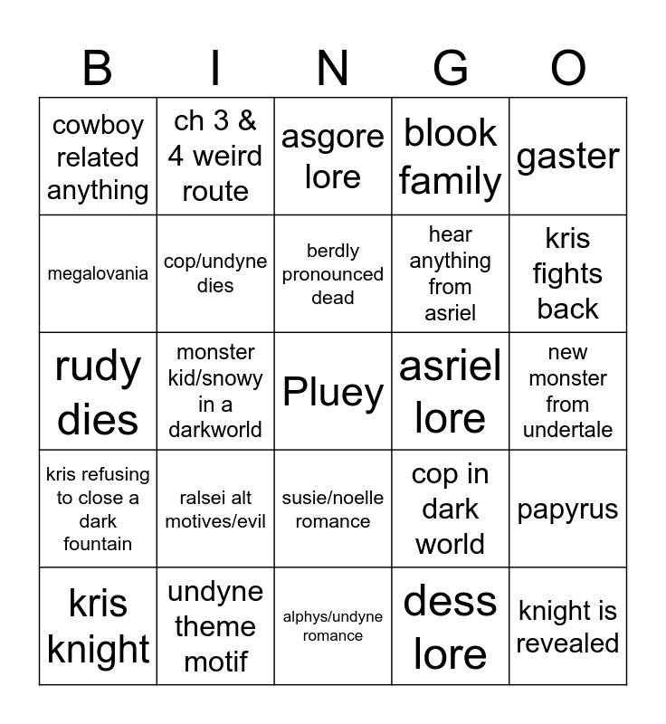 This bingo card has a free space and 24 words: kris knight, ralsei alt motives/evil, berdly pronounced dead, dess lore, gaster, cowboy related anything, ch 3 & 4 weird route, asgore lore, asriel lore, new monster from undertale, rudy dies, cop/undyne dies, cop in dark world, papyrus, megalovania, undyne theme motif, alphys/undyne romance, blook family, kris fights back, kris refusing to close a dark fountain, monster kid/snowy in a darkworld, susie/noelle romance, hear anything from asriel and knight is revealed.