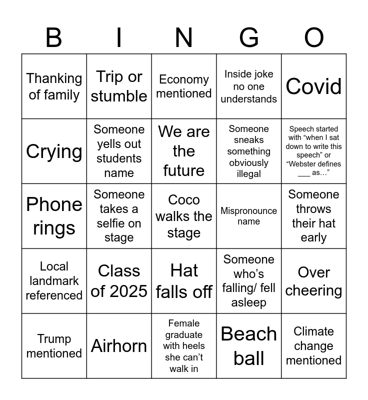 This bingo card has a free space and 24 words: Class of 2025, Airhorn, We are the future, Trump mentioned, Covid, Thanking of family, Crying, Trip or stumble, Mispronounce name, Hat falls off, Someone sneaks something obviously illegal, Phone rings, Someone who’s falling/ fell asleep, Over cheering, Someone yells out students name, Beach ball, Someone throws their hat early, Economy mentioned, Speech started with “when I sat down to write this speech” or “Webster defines ___ as…”, Someone takes a selfie on stage, Climate change mentioned, Local landmark referenced, Inside joke no one understands and Female graduate with heels she can’t walk in.