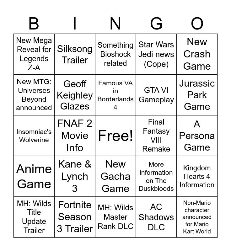 This bingo card has a free space and 24 words: Kane & Lynch 3, Fortnite Season 3 Trailer, Famous VA in Borderlands 4, MH: Wilds Title Update Trailer, New Crash Game, New Mega Reveal for Legends Z-A, New MTG: Universes Beyond announced, Silksong Trailer, Final Fantasy VIII Remake, New Gacha Game, GTA VI Gameplay, Insomniac's Wolverine, More information on The Duskbloods, Kingdom Hearts 4 Information, Geoff Keighley Glazes, AC Shadows DLC, A Persona Game, Something Bioshock related, Jurassic Park Game, FNAF 2 Movie Info, Non-Mario character announced for Mario Kart World, Anime Game, Star Wars Jedi news (Cope) and MH: Wilds Master Rank DLC.