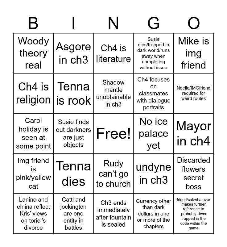 This bingo card has a free space and 24 words: Tenna dies, Catti and jockington are one entity in battles, Shadow mantle unobtainable in ch3, Lanino and elnina reflect Kris’ views on toriel’s divorce, Mike is img friend, Woody theory real, Ch4 is religion, Asgore in ch3, No ice palace yet, Rudy can’t go to church, Ch4 focuses on classmates with dialogue portraits, Carol holiday is seen at some point, undyne in ch3, Discarded flowers secret boss, Tenna is rook, Currency other than dark dollars in one or more of the chapters, Mayor in ch4, Ch4 is literature, Noelle/IMGfriend required for weird routes, Susie finds out darkners are just objects, friend/cat/whatever makes further reference to probably-dess trapped in the code within the game, img friend is pink/yellow cat, Susie dies/trapped in dark world/runs away when completing without issue and Ch3 ends immediately after fountain is sealed.