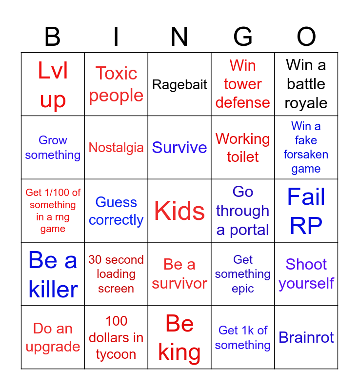This bingo card has a free space and 24 words: Do an upgrade, 30 second loading screen, Survive, Get 1k of something, Win a battle royale, Lvl up, Toxic people, Ragebait, Go through a portal, Fail RP, Get 1/100 of something in a rng game, Nostalgia, Get something epic, Shoot yourself, Grow something, 100 dollars in tycoon, Be king, Win tower defense, Win a fake forsaken game, Be a killer, Guess correctly, Be a survivor, Working toilet and Brainrot.