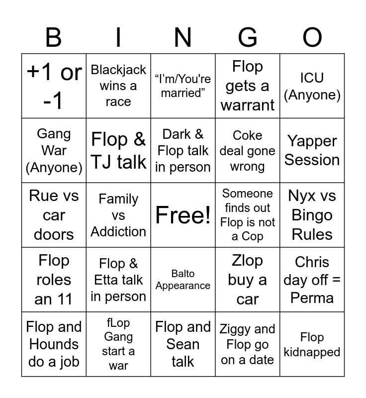 This bingo card has a free space and 37 words: Mods/Chat Bully Chris, Birthday Stream! (Anyone in Chat), Chris mistaken for Chandler, Flop & TJ talk, Chris day off = Perma, Flop & Etta talk in person, Dark & Flop talk in person, Perma (Anyone), ICU (Anyone), Food Takes [Good/Bad], Family vs Addiction, Flop gets a warrant, Flop kidnapped, Nyx vs Bingo Rules, Gang War (Anyone), Flop roles an 11, Chance Appearance, “I’m/You're married”, Balto Appearance, Someone finds out Flop is not a Cop, +1 or -1, Yapper Session, Flop and Hounds do a job, Flop and Sean talk, Flop makes a brick of Coke, Ziggy and Flop go on a date, Blackjack wins a race, Flop does a line of coke, Flop blows up MRPD / Bradfords car, Flop gets terrorism, Flop and Silas do a job together, fLop Gang start a war, Rue vs car doors, Flop shoots Brian, Zlop buy a car, Coke deal gone wrong and Flop get his letter delivered.