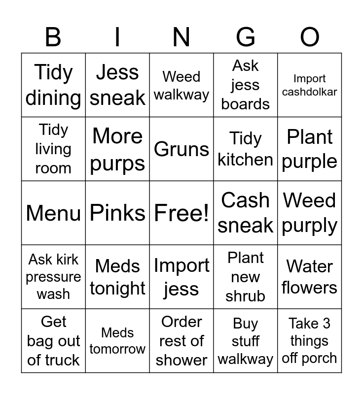 This bingo card has a free space and 24 words: Meds tonight, Meds tomorrow, Gruns, Get bag out of truck, Import cashdolkar, Tidy dining, Tidy living room, Jess sneak, Cash sneak, Import jess, Tidy kitchen, Menu, Plant new shrub, Water flowers, More purps, Buy stuff walkway, Weed purply, Weed walkway, Plant purple, Pinks, Take 3 things off porch, Ask kirk pressure wash, Ask jess boards and Order rest of shower.