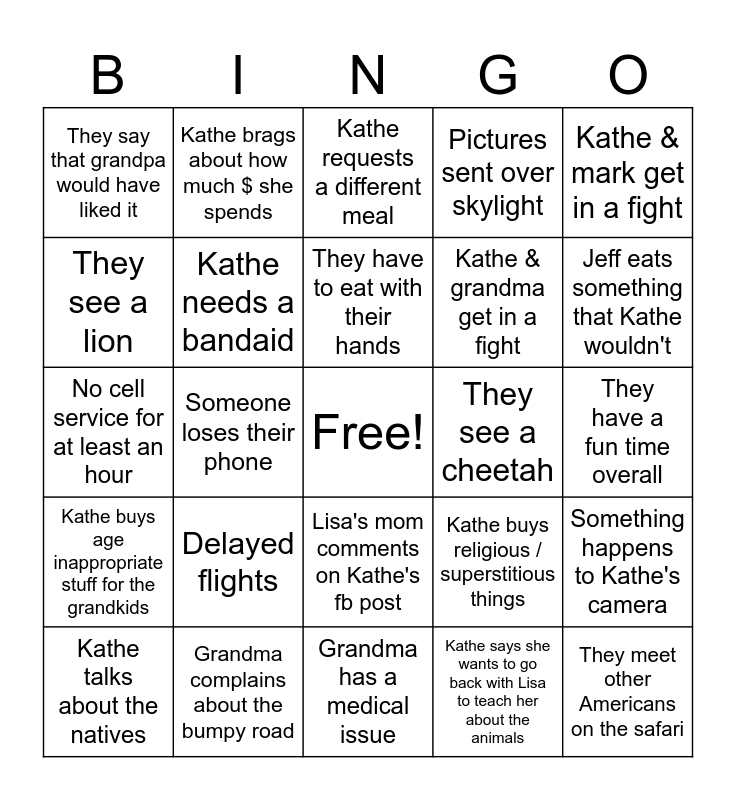 This bingo card has a free space and 24 words: Delayed flights, Grandma complains about the bumpy road, They have to eat with their hands, Kathe talks about the natives, Kathe & mark get in a fight, They say that grandpa would have liked it, They see a lion, Kathe brags about how much $ she spends, They see a cheetah, Lisa's mom comments on Kathe's fb post, Kathe & grandma get in a fight, No cell service for at least an hour, Kathe buys religious / superstitious things, Something happens to Kathe's camera, Kathe needs a bandaid, Kathe says she wants to go back with Lisa to teach her about the animals, They have a fun time overall, Kathe requests a different meal, Jeff eats something that Kathe wouldn't, Someone loses their phone, They meet other Americans on the safari, Kathe buys age inappropriate stuff for the grandkids, Pictures sent over skylight and Grandma has a medical issue.