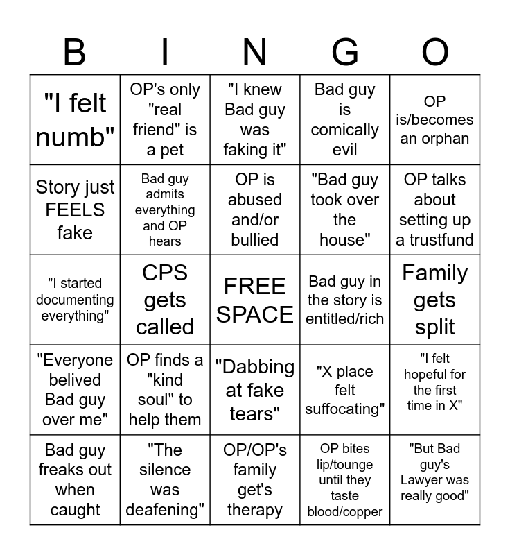 This bingo card has a free space and 24 words: OP finds a "kind soul" to help them, "The silence was deafening", OP is abused and/or bullied, Bad guy freaks out when caught, OP is/becomes an orphan, "I felt numb", Story just FEELS fake, OP's only "real friend" is a pet, Bad guy in the story is entitled/rich, "Dabbing at fake tears", "Bad guy took over the house", "I started documenting everything", "X place felt suffocating", "I felt hopeful for the first time in X", Bad guy admits everything and OP hears, OP bites lip/tounge until they taste blood/copper, Family gets split, "I knew Bad guy was faking it", OP talks about setting up a trustfund, CPS gets called, "But Bad guy's Lawyer was really good", "Everyone belived Bad guy over me", Bad guy is comically evil and OP/OP's family get's therapy.