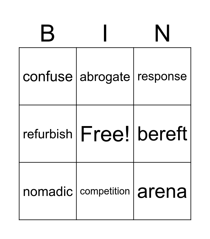 This bingo card has a free space and 8 words: bereft, response, abrogate, nomadic, confuse, arena, refurbish and competition.