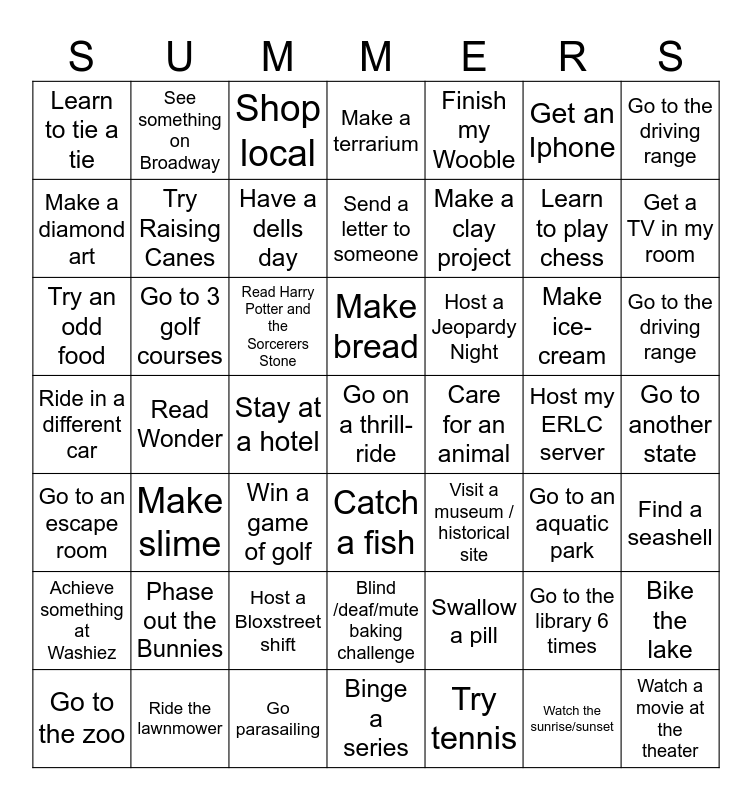 This bingo card has 49 words: Go to the library 6 times, Learn to play chess, Try tennis, Read Wonder, Read Harry Potter and the Sorcerers Stone, Go to another state, See something on Broadway, Go parasailing, Get an Iphone, Catch a fish, Go to the driving range, Make a terrarium, Make ice-cream, Host a Jeopardy Night, Phase out the Bunnies, Host my ERLC server, Make a diamond art, Get a TV in my room, Bike the lake, Finish my Wooble, Make a clay project, Stay at a hotel, Learn to tie a tie, Try Raising Canes, Go to the zoo, Have a dells day, Go to the driving range, Ride the lawnmower, Make bread, Go to 3 golf courses, Watch a movie at the theater, Care for an animal, Achieve something at Washiez, Host a Bloxstreet shift, Ride in a different car, Visit a museum / historical site, Go to an aquatic park, Find a seashell, Try an odd food, Win a game of golf, Blind /deaf/mute baking challenge, Go to an escape room, Go on a thrill-ride, Binge a series, Send a letter to someone, Shop local, Swallow a pill, Make slime and Watch the sunrise/sunset.