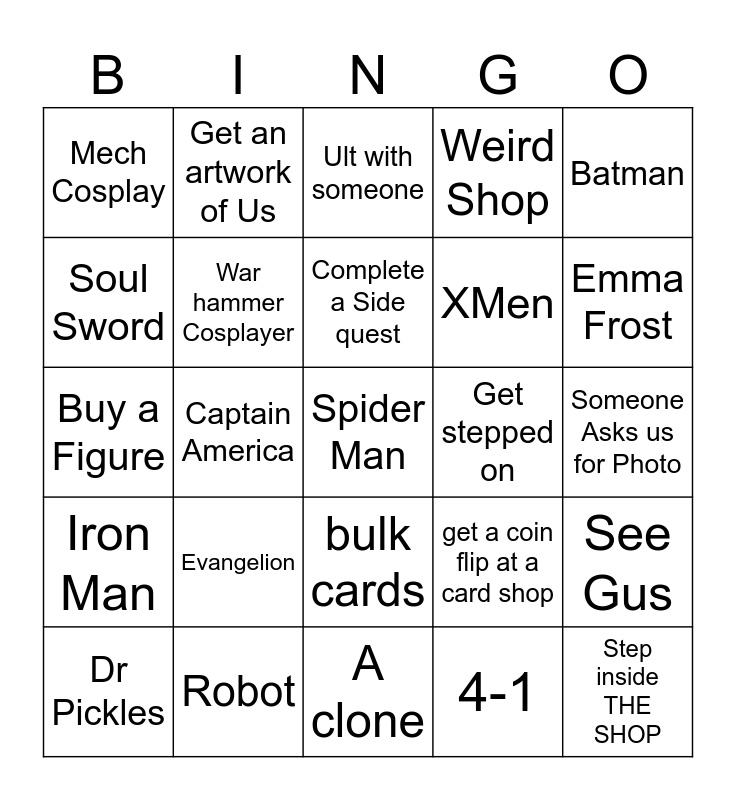 This bingo card has a free space and 24 words: Evangelion, Robot, Complete a Side quest, Dr Pickles, Batman, Mech Cosplay, Soul Sword, Get an artwork of Us, Get stepped on, bulk cards, XMen, Buy a Figure, get a coin flip at a card shop, See Gus, War hammer Cosplayer, 4-1, Someone Asks us for Photo, Ult with someone, Emma Frost, Captain America, Step inside THE SHOP, Iron Man, Weird Shop and A clone.
