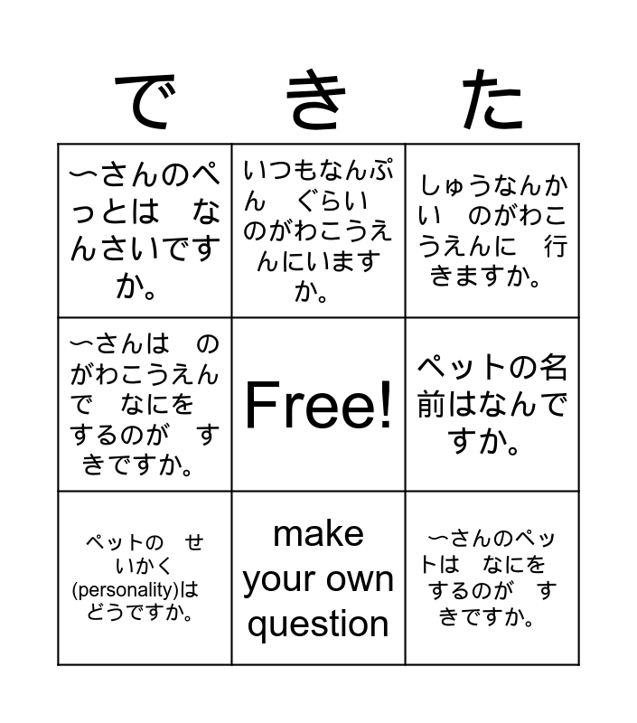 This bingo card has a free space and 8 words: ペットの名前はなんですか。, しゅうなんかい のがわこうえんに 行きますか。, いつもなんぷん ぐらい のがわこうえんにいますか。, ペットの せいかく(personality)は どうですか。, 〜さんのぺっとは なんさいですか。, 〜さんのペットは なにを するのが すきですか。, 〜さんは のがわこうえんで なにを するのが すきですか。 and make your own question.