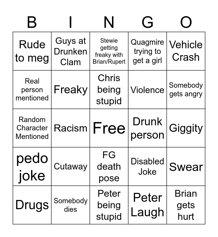 This bingo card has a free space and 24 words: Cutaway, Somebody dies, Chris being stupid, Drugs, Vehicle Crash, Rude to meg, Real person mentioned, Guys at Drunken Clam, Drunk person, FG death pose, Violence, Random Character Mentioned, Disabled Joke, Swear, Freaky, Peter Laugh, Giggity, Stewie getting freaky with Brian/Rupert, Somebody gets angry, Racism, Brian gets hurt, pedo joke, Quagmire trying to get a girl and Peter being stupid.