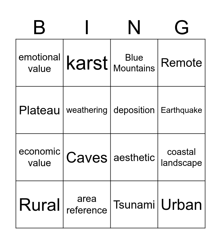 This bingo card has 24 words: Tectonic activity, orientation, Earthquake, spiritual value, Plateau, emotional value, weathering, karst, area reference, cityscape, economic value, aesthetic, erosion, volcano, deposition, Uluru, Tsunami, Blue Mountains, Caves, coastal landscape, Rural, Urban, Remote and Desert.