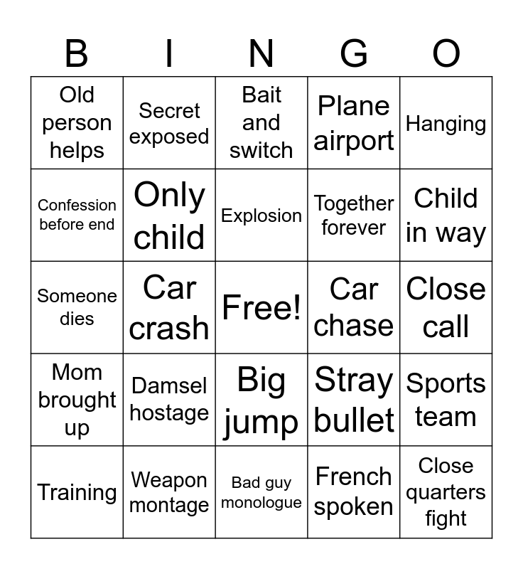 This bingo card has a free space and 24 words: Damsel hostage, Weapon montage, Explosion, Training, Hanging, Old person helps, Confession before end, Secret exposed, Car chase, Big jump, Together forever, Someone dies, Stray bullet, Sports team, Only child, French spoken, Close call, Bait and switch, Child in way, Car crash, Close quarters fight, Mom brought up, Plane airport and Bad guy monologue.