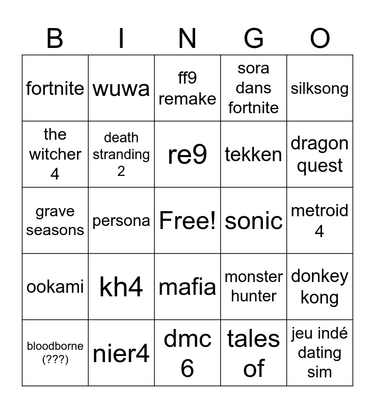 This bingo card has a free space and 24 words: kh4, nier4, re9, bloodborne (???), silksong, fortnite, the witcher 4, wuwa, sonic, mafia, tekken, grave seasons, monster hunter, donkey kong, death stranding 2, tales of, metroid 4, ff9 remake, dragon quest, persona, jeu indé dating sim, ookami, sora dans fortnite and dmc 6.