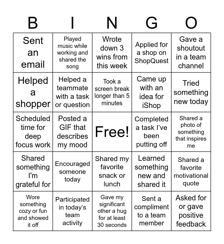This bingo card has a free space and 32 words: Sent a compliment to a team member, Shared a photo of my workspace, Posted a GIF that describes my mood, Had a 1:1 or casual chat with someone I don’t usually talk to, Shared something I'm grateful for, Helped a teammate with a task or question, Gave a shoutout in a team channel, Shared a favorite motivational quote, Played music while working and shared the song, Drank 8 glasses of water, Took a screen break longer than 5 minutes, Wrote down 3 wins from this week, Asked someone about their weekend plans, Shared a productivity tip, Completed a task I’ve been putting off, Talked about ShopCon in any of our platforms, Wore something cozy or fun and showed it off, Scheduled time for deep focus work, Shared my favorite snack or lunch, Encouraged someone today, Learned something new and shared it, Said “thank you” meaningfully, Shared a photo of something that inspires me, Participated in today’s team activity, Asked for or gave positive feedback, Applied for a shop on ShopQuest, Came up with an idea for iShop, Helped a shopper, Sent an email, Gave my significant other a hug for at least 30 seconds, Hopped in the Shopper's Lounge and Tried something new today.