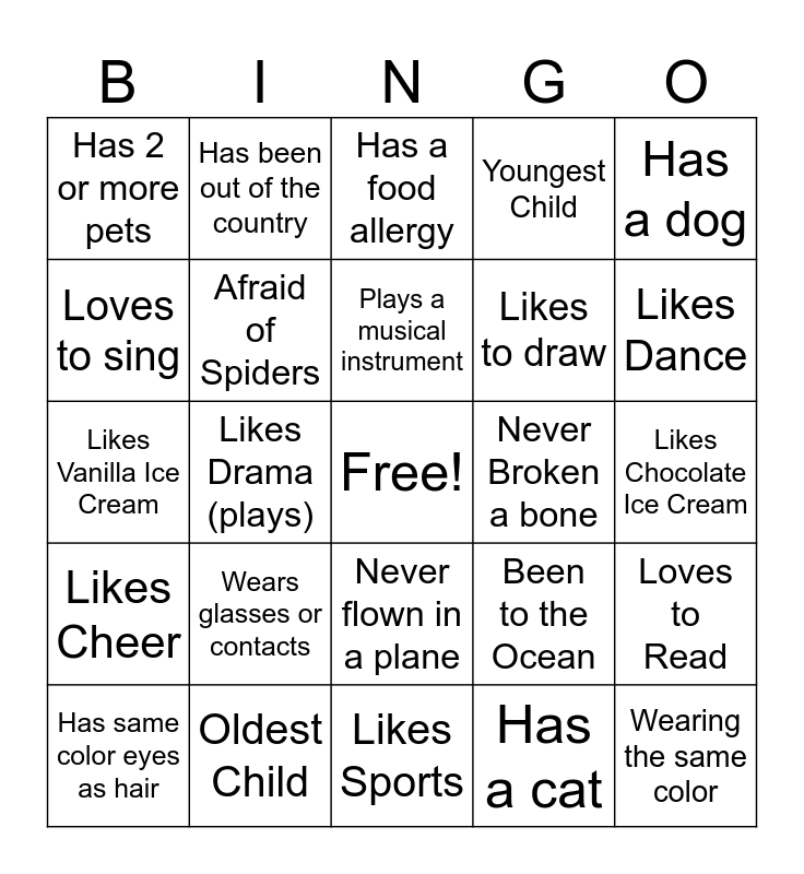 This bingo card has a free space and 24 words: Has same color eyes as hair, Wears glasses or contacts, Plays a musical instrument, Has a cat, Has a dog, Has 2 or more pets, Has been out of the country, Has a food allergy, Never Broken a bone, Likes Chocolate Ice Cream, Likes Vanilla Ice Cream, Afraid of Spiders, Been to the Ocean, Loves to Read, Loves to sing, Oldest Child, Likes Sports, Youngest Child, Likes Dance, Likes Cheer, Likes Drama (plays), Never flown in a plane, Likes to draw and Wearing the same color.