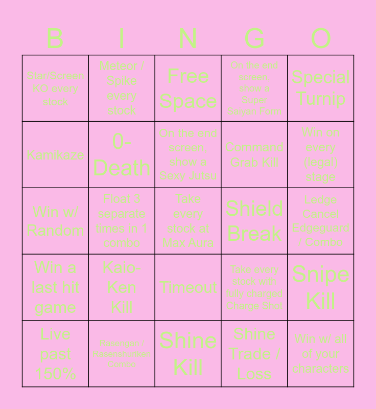 This bingo card has 25 words: Kaio-Ken Kill, Shine Kill, On the end screen, show a Sexy Jutsu, Live past 150%, Special Turnip, Star/Screen KO every stock, Kamikaze, Meteor / Spike every stock, Shield Break, Timeout, Command Grab Kill, Win w/ Random, Take every stock with fully charged Charge Shot, Snipe Kill, 0-Death, Win w/ all of your characters, Ledge Cancel Edgeguard / Combo, Free Space, Win on every (legal) stage, Float 3 separate times in 1 combo, Take every stock at Max Aura, Rasengan / Rasenshuriken Combo, Win a last hit game, On the end screen, show a Super Saiyan Form and Shine Trade / Loss.