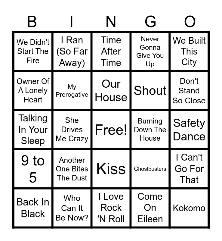 This bingo card has a free space and 50 words: I'm Gonna Be (500 Miles), Kokomo, Love Shack, I Love Rock 'N Roll, Another One Bites The Dust, Call Me, I Ran (So Far Away), Like A Virgin, Owner Of A Lonely Heart, She Blinded Me With Science, My Prerogative, Never Gonna Give You Up, I Can't Go For That, Ghostbusters, Venus, Electric Avenue, Our House, Burning Down The House, You Dropped A Bomb On Me, We Built This City, She Drives Me Crazy, Come On Eileen, We Didn't Start The Fire, Shout, I Think We're Alone Now, Jump, Don't Stand So Close, White Wedding, Time After Time, Kiss, Heaven Is A Place On Earth, Any Way You Want It, Love Is A Battlefield, What's Love Got To Do With It, Who Can It Be Now?, Vacation, Raspberry Beret, Rock The Casbah, Message In A Bottle, Safety Dance, Careless Whisper, Your Love, Danger Zone, Sweet Child O' Mine, Back In Black, Talking In Your Sleep, Summer of 69', You Give Love A Bad Name, 9 to 5 and Cult Of Personality.