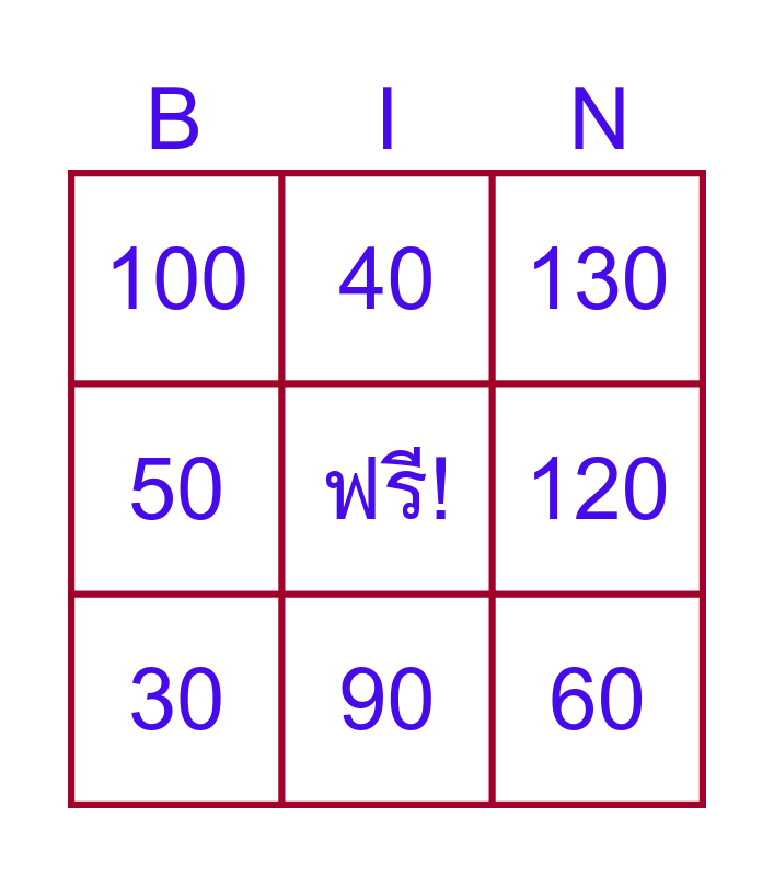 This bingo card has a free space and 14 words: 10, 20, 30, 40, 50, 60, 70, 80, 90, 100, 110, 120, 130 and 140.
