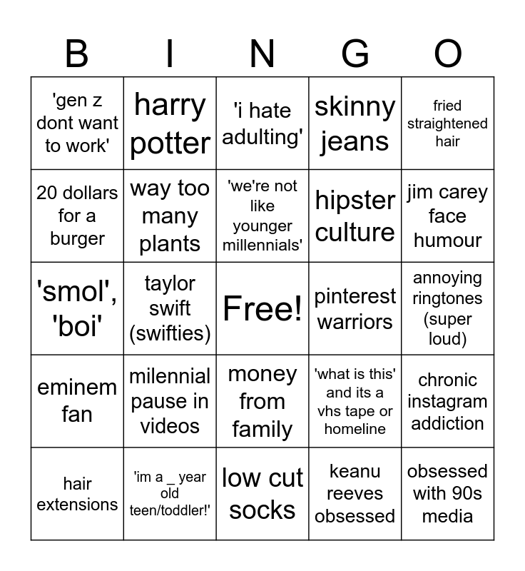 This bingo card has a free space and 34 words: at war with gen z, keanu reeves obsessed, disney fan, 'doggo', 'fur baby', eminem fan, way too many plants, fried straightened hair, hair extensions, harry potter, house music, 'we're not like younger millennials', 'i hate adulting', annoying things dangling, slogan tshirts, pinterest warriors, jim carey face humour, 'im a _ year old teen/toddler!', 'smol', 'boi', milennial pause in videos, 'what is this' and its a vhs tape or homeline, money from family, FRIENDS, seinfeld, 'gen z dont want to work', annoying ringtones (super loud), low cut socks, obsessed with 90s media, skinny jeans, avocado toast, hipster culture, 20 dollars for a burger, loud music instore, taylor swift (swifties), chronic instagram addiction and assuming gen z is 'one-upping' them.