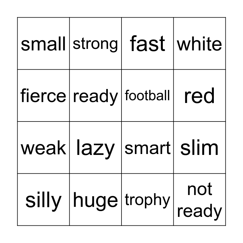 This bingo card has 20 words: slim, bulky, fast, slow, silly, fierce, huge, small, weak, strong, lazy, smart, ready, not ready, football, team, red, white, trophy and short.