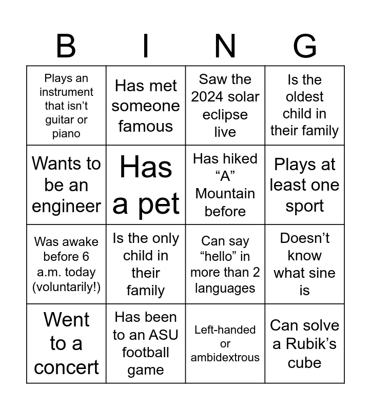 This bingo card has 16 words: Has been to an ASU football game, Doesn’t know what sine is, Saw the 2024 solar eclipse live, Plays an instrument that isn’t guitar or piano, Was awake before 6 a.m. today (voluntarily!), Has met someone famous, Can say “hello” in more than 2 languages, Left-handed or ambidextrous, Wants to be an engineer, Has a pet, Went to a concert, Is the oldest child in their family, Is the only child in their family, Plays at least one sport, Has hiked “A” Mountain before and Can solve a Rubik’s cube.