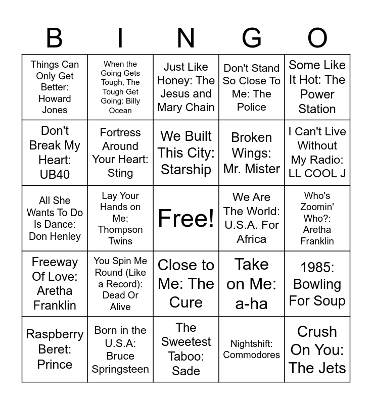 This bingo card has a free space and 50 words: Back In Time: Huey Lewis & The News, Crush On You: The Jets, Kiss Me: Stephen Duffy, The Sweetest Taboo: Sade, You Spin Me Round (Like a Record): Dead Or Alive, We Close Our Eyes: Go West, When the Going Gets Tough, The Tough Get Going: Billy Ocean, In My House: Mary Jane Girls, Don't Break My Heart: UB40, What About Love?: Heart, Fortress Around Your Heart: Sting, Don't Stand So Close To Me: The Police, 1985: Bowling For Soup, Take on Me: a-ha, Don't You (Forget About Me): Simple Minds, Crazy For You: Madonna, We Built This City: Starship, We Are The World: U.S.A. For Africa, Running Up That Hill: Kate Bush, Some Like It Hot: The Power Station, Lay Your Hands on Me: Thompson Twins, Nightshift: Commodores, Things Can Only Get Better: Howard Jones, Broken Wings: Mr. Mister, Dancing in the Street: David Bowie, Saving All My Love for You: Whitney Houston, I Can't Live Without My Radio: LL COOL J, Addicted To Love: Robert Palmer, Just Like Honey: The Jesus and Mary Chain, Close to Me: The Cure, Nineteen Hundred And Eighty Five: Paul McCartney, Summer Of '69: Bryan Adams, Walking On Sunshine: Katrina & The Waves, Don't Come Around Here No More: Tom Petty and the Heartbreakers, Born in the U.S.A: Bruce Springsteen, Burning Heart: Survivor, Eye of the Tiger: Survivor, Living in America: James Brown, I Got You Babe: UB40, Who's Zoomin' Who?: Aretha Franklin, Everything She Wants: Wham!, Nikita: Elton John, We Don't Need Another Hero: Tina Turner, Small Town: John Mellencamp, Raspberry Beret: Prince, All She Wants To Do Is Dance: Don Henley, If You Love Somebody Set Them Free: Sting, The Boys Of Summer: Don Henley, Freeway Of Love: Aretha Franklin and Never Surrender: Corey Hart.