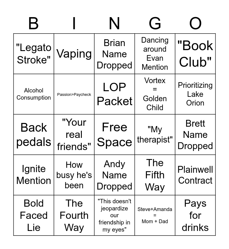 This bingo card has a free space and 24 words: How busy he's been, The Fourth Way, LOP Packet, Bold Faced Lie, "Book Club", "Legato Stroke", Alcohol Consumption, Vaping, "My therapist", Andy Name Dropped, Vortex = Golden Child, Back pedals, The Fifth Way, Plainwell Contract, Passion>Paycheck, Steve+Amanda = Mom + Dad, Brett Name Dropped, Brian Name Dropped, Prioritizing Lake Orion, "Your real friends", Pays for drinks, Ignite Mention, Dancing around Evan Mention and "This doesn't jeopardize our friendship in my eyes".