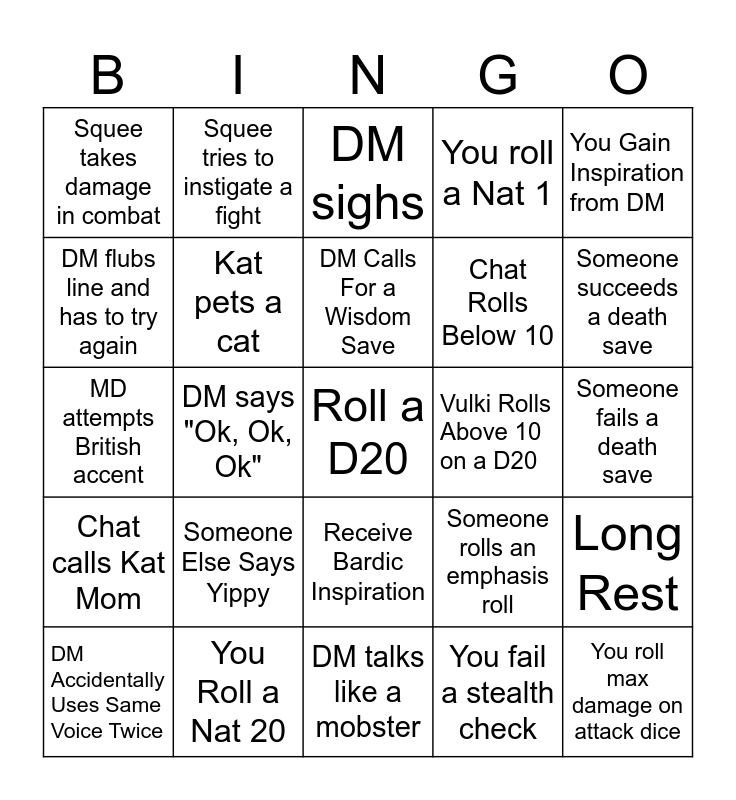 This bingo card has a free space and 24 words: Someone Else Says Yippy, You Roll a Nat 20, DM Calls For a Wisdom Save, DM Accidentally Uses Same Voice Twice, You Gain Inspiration from DM, Squee takes damage in combat, DM flubs line and has to try again, Squee tries to instigate a fight, Vulki Rolls Above 10 on a D20, Receive Bardic Inspiration, Chat Rolls Below 10, MD attempts British accent, Someone rolls an emphasis roll, Long Rest, Kat pets a cat, You fail a stealth check, Someone fails a death save, DM sighs, Someone succeeds a death save, DM says "Ok, Ok, Ok", You roll max damage on attack dice, Chat calls Kat Mom, You roll a Nat 1 and DM talks like a mobster.