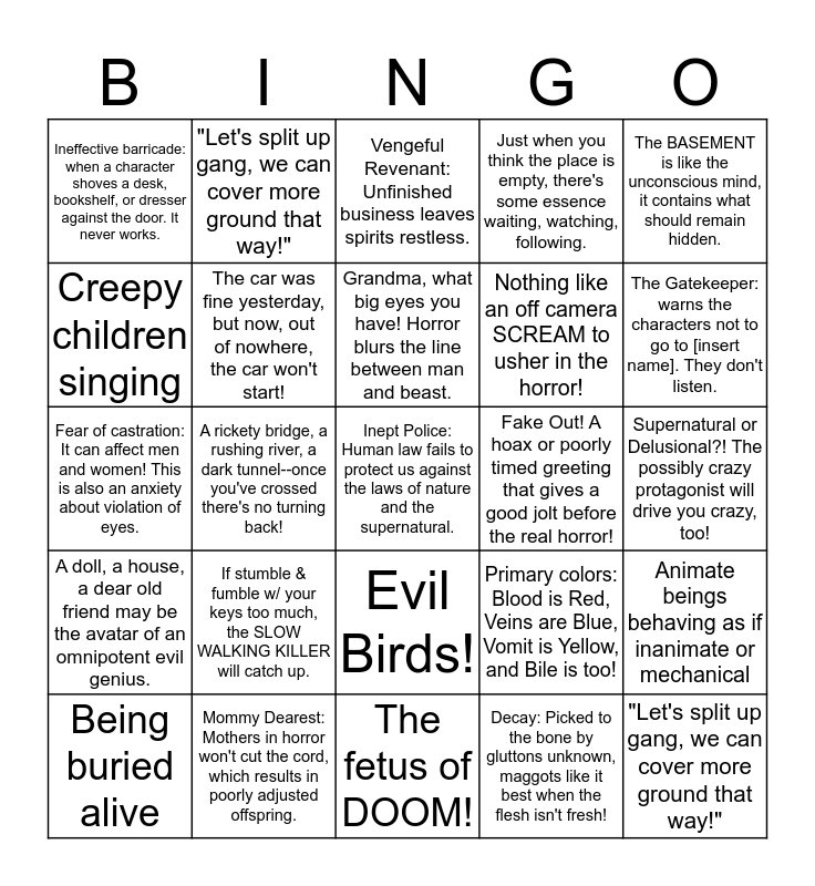 This bingo card has 26 words: Evil Birds!, Decay: Picked to the bone by gluttons unknown, maggots like it best when the flesh isn't fresh!, Grandma, what big eyes you have! Horror blurs the line between man and beast., Mommy Dearest: Mothers in horror won't cut the cord, which results in poorly adjusted offspring., The BASEMENT is like the unconscious mind, it contains what should remain hidden., Ineffective barricade: when a character shoves a desk, bookshelf, or dresser against the door. It never works., Creepy children singing, "Let's split up gang, we can cover more ground that way!", Supernatural or Delusional?! The possibly crazy protagonist will drive you crazy, too!, Primary colors: Blood is Red, Veins are Blue, Vomit is Yellow, and Bile is too!, Nothing like an off camera SCREAM to usher in the horror!, Fear of castration: It can affect men and women! This is also an anxiety about violation of eyes., Animate beings behaving as if inanimate or mechanical, Being buried alive, A rickety bridge, a rushing river, a dark tunnel--once you've crossed there's no turning back!, The double (twins, doppelgängers, etc), Just when you think the place is empty, there's some essence waiting, watching, following., A doll, a house, a dear old friend may be the avatar of an omnipotent evil genius., Vengeful Revenant: Unfinished business leaves spirits restless., Inept Police: Human law fails to protect us against the laws of nature and the supernatural., The Gatekeeper: warns the characters not to go to [insert name]. They don't listen., The fetus of DOOM!, Fake Out! A hoax or poorly timed greeting that gives a good jolt before the real horror!, If stumble & fumble w/ your keys too much, the SLOW WALKING KILLER will catch up., The car was fine yesterday, but now, out of nowhere, the car won't start! and "Let's split up gang, we can cover more ground that way!".
