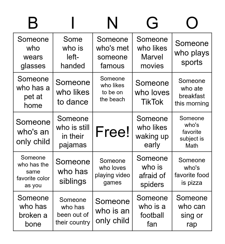 This bingo card has a free space and 24 words: Someone who has siblings, Someone who has been out of their country, Someone who likes to be on the beach, Someone who has broken a bone, Someone who plays sports, Someone who wears glasses, Someone who has a pet at home, Some who is left-handed, Someone who likes waking up early, Someone who loves playing video games, Someone who loves TikTok, Someone who's an only child, Someone who is afraid of spiders, Someone who's favorite food is pizza, Someone who likes to dance, Someone who is a football fan, Someone who's favorite subject is Math, Someone who's met someone famous, Someone who ate breakfast this morning, Someone who is still in their pajamas, Someone who can sing or rap, Someone who has the same favorite color as you, Someone who likes Marvel movies and Someone who is an only child.