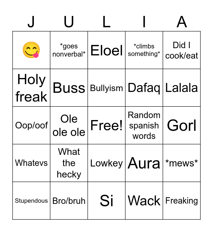 This bingo card has a free space and 24 words: What the hecky, Bro/bruh, Bullyism, Stupendous, Did I cook/eat, 😋, Holy freak, *goes nonverbal*, Random spanish words, Lowkey, Dafaq, Oop/oof, Aura, *mews*, Buss, Wack, Gorl, Eloel, Lalala, Ole ole ole, Freaking, Whatevs, *climbs something* and Si.