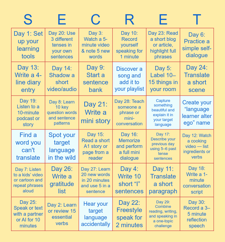 This bingo card has 36 words: Find a word you can't translate, Spot your target language in the wild, Hear your target language accidentally, Discover a song and add it to your playlist, Capture something beautiful and explain it in your target language, Create your “language learner alter ego” name, Day 1: Set up your learning tools, Day 2: Learn or review 15 essential verbs, Day 3: Watch a 5-minute video & note 5 new words, Day 4: Write 10 short “I” sentences, Day 5: Label 10–15 things in your room, Day 6: Practice a simple self-dialogue, Day 7: Listen to a kids’ video or cartoon and repeat phrases aloud, Day 8: Learn 10 key question words and sentence patterns, Day 9: Start a sentence bank, Day 10: Record yourself speaking for 1 minute, Day 11: Translate a short paragraph, Day 12: Watch a cooking video — list ingredients or verbs, Day 13: Write a 4-line diary entry, Day 14: Shadow a short video/audio, Day 15: Read a short A1 story or page from a reader, Day 16: Memorize and perform a full mini dialogue, Day 17: Describe your previous day using 5–6 past tense sentences, Day 18: Write a 1-minute conversation script, Day 19: Listen to a 10-minute podcast or story, Day 20: Use 3 different tenses in your own sentences, Day 21: Write a mini story, Day 22: Freestyle speak for 2 minutes, Day 23: Read a short blog or article, highlight full phrases, Day 24: Translate a short scene, Day 25: Speak or text with a partner or AI for 10 minutes, Day 26: Write a gratitude list, Day 27: Learn 20 new words in 20 minutes and use 5 in a sentence, Day 28: Teach someone a phrase or mini-conversation, Day 29: Combine reading, writing, and speaking in a one-topic challenge and Day 30: Record a 3–5 minute reflection speech.