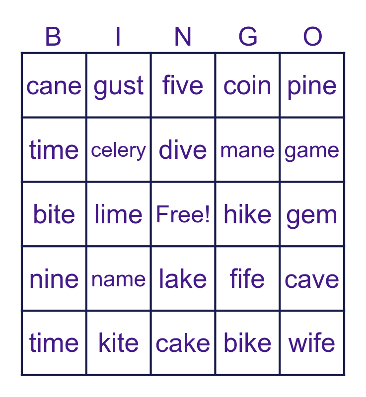 This bingo card has a free space and 24 words: name, kite, dive, time, pine, cane, time, gust, hike, lake, mane, bite, fife, cave, celery, bike, gem, five, game, lime, wife, nine, coin and cake.
